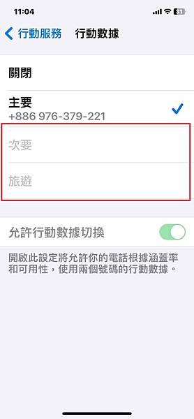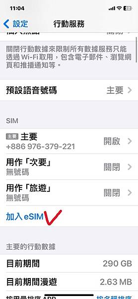完成後在手機裡的行動服務-SIM頁面下方-出現你剛剛設定的旅遊或是次要頁面,
